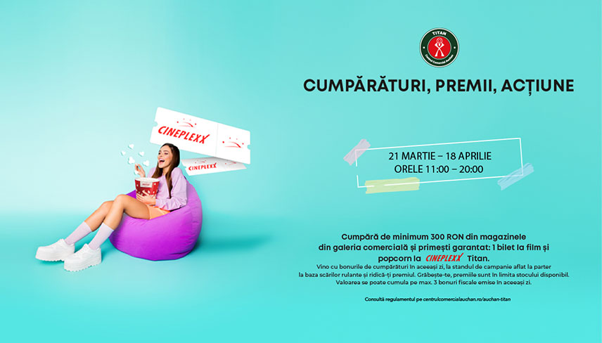 În perioada 21 martie - 18 aprilie, pentru cumpărături de minimum 300 RON din magazinele noastre, ai primit garantat 1 bilet la film și popcorn pentru a te bucura și relaxa la un film bun la Cineplexx Titan.