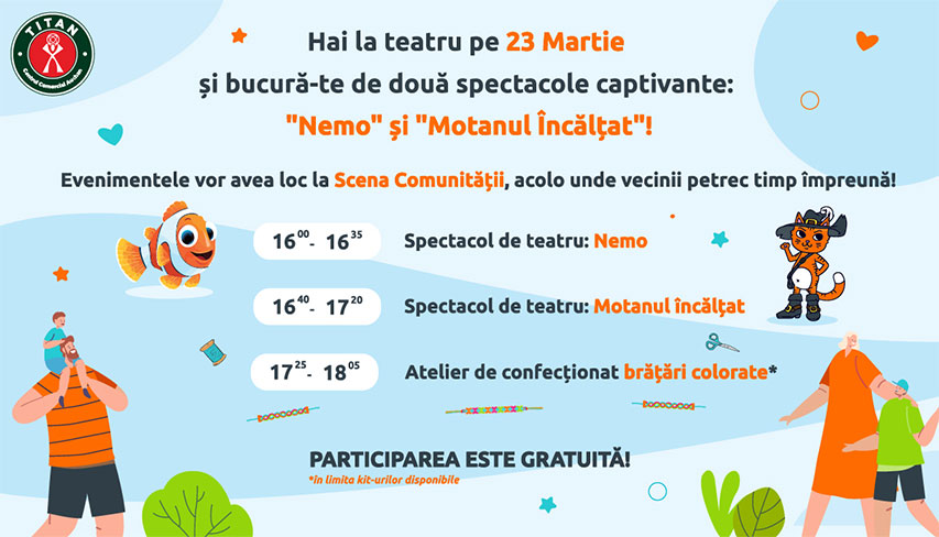 16:00 - 16:35 Spectacol de teatru: Nemo16:40 - 17:20 Spectacol de teatru: Motanul încălțat