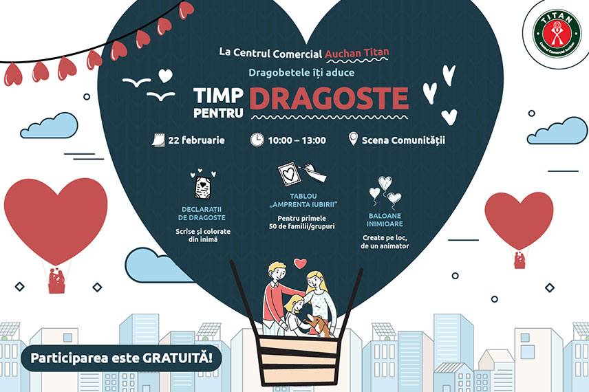 Pe 22 februarie, între orele 10:00 – 13:00, te așteptăm la Centrul Comercial Auchan Titan să sărbătorim Dragobetele așa cum se cuvine: cu timp petrecut împreună, creativitate, zâmbete și emoții autentice.