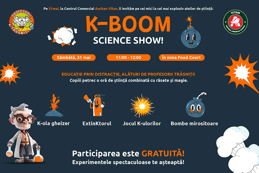 Pe 31 mai, între orele 11:00 și 12:00, în zona Food Court din Centrul Comercial Auchan Vitan, copiii sunt invitați să descopere știința într-un mod spectaculos și amuzant, în cadrul K-BOOM SCIENCE SHOW, un eveniment interactiv semnat de îndrăgiții Profesori Trăsniți.