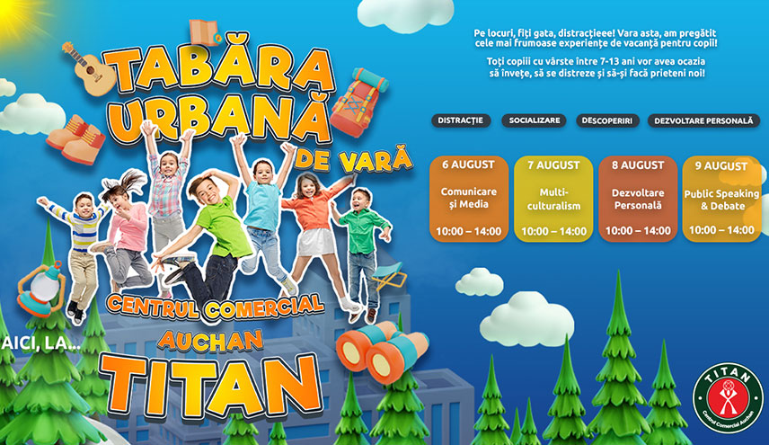 Între 6 și 9 august, Centrul Comercial Auchan Titan continuă sărbătorirea celor 18 ani de activitate cu un nou concept de evenimente dedicate copiilor. În cadrul Taberelor Urbane de Vară, copiii cu vârste cuprinse între 7 și 13 ani pot participa GRATUIT la o serie de cursuri educative și interactive. Iată ce le-am pregătit micilor participanți: