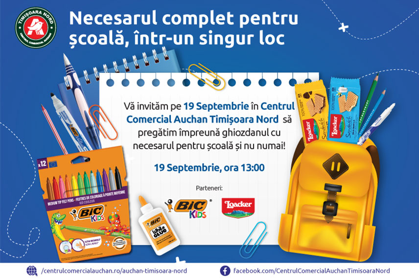 Pe 19 noiembrie, galeria Centrului Comercial Auchan Timișoara Nord va prinde viață într-un mod cu totul special, cu ocazia unui eveniment dedicat întoarcerii la școală – Back to School, organizat alături de partenerii, BIC România și Loacker.