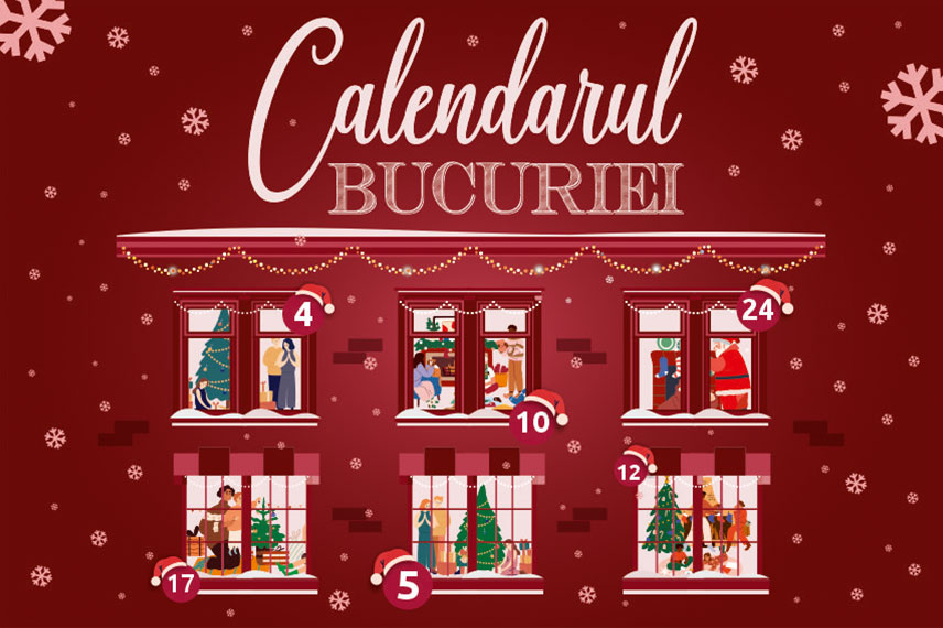 Fiecare fereastră din Calendarul Bucuriei ascunde o surpriză pregătită cu grijă: parfumuri, produse de beauty și wellness, accesorii elegante, articole de modă, gadget-uri, bilete la film pentru seri de Crăciun petrecute în familie și multe alte idei de cadouri.