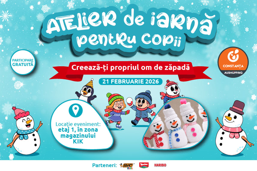 Pe 21 februarie, la Aushopping Constanța, are loc evenimentul dedicat copiilor „Atelierele de iarnă pentru copii: Creează-ți propriul om de zăpadă!” – o activitate creativă în care cei mici vor realiza un om de zăpadă din material textil, pe care îl vor putea lua acasă la final.