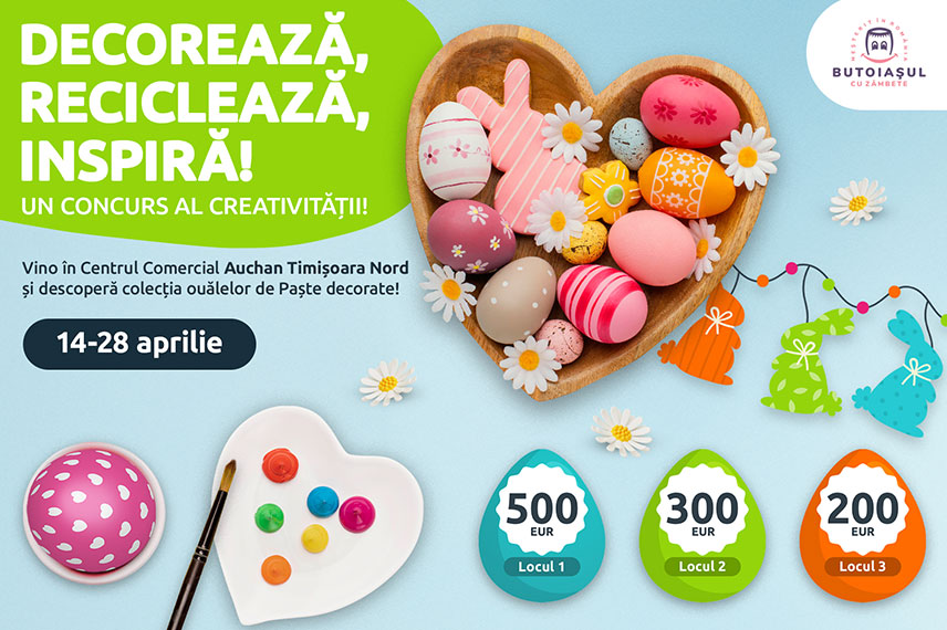 Ouăle de Paște expuse în galeria comercială au fost realizate cu mult talent și imaginație de elevii Școlii Primare Moșnița Veche! Le găsești pe culoarul galeriei comerciale, în zona magazinului Proges. Oprește-te, admiră-le și, dacă îți plac, oferă-le sprijinul tău!