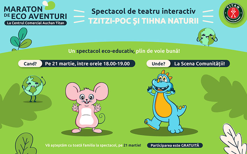 Dacă vrei să oferi copilului tău o experiență de neuitat, plină de joacă și învățare, te invităm la Scena Comunității din Centrul Comercial Auchan Titan, pe 21 martie, între 18:00 și 19:00, pentru un spectacol deosebit: Tzitzi, Poc și Tihna Naturii!