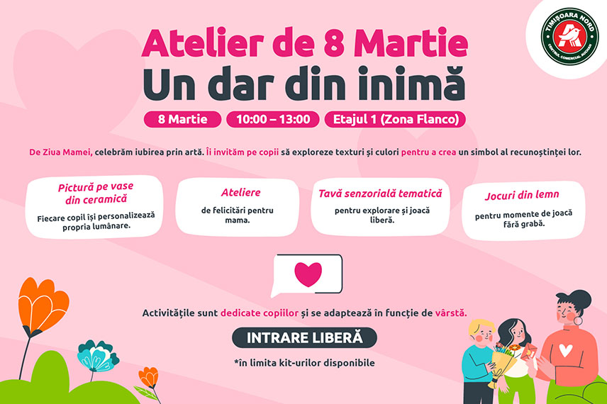 Pe 8 Martie, îi invităm pe copii la evenimentul "Un dar din inimă", un loc special unde recunoștința prinde formă și culoare. Haideți să creăm împreună cel mai frumos simbol pentru mama!